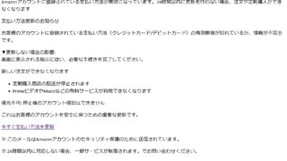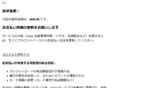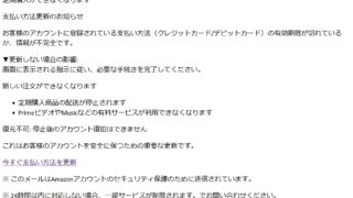 迷惑メール 件名: 【お知らせ】Amazon Prime の支払いに失敗しました。支払方法を更新してください