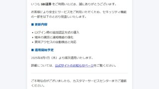 迷惑メール 件名: 【SBI証券】セキュリティ機能更新に関するご案内