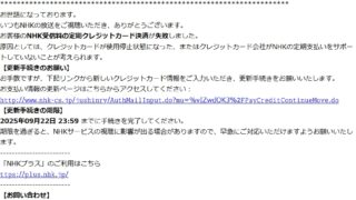 迷惑メール 件名: NHK受信料定期支払い情報更新のお願い