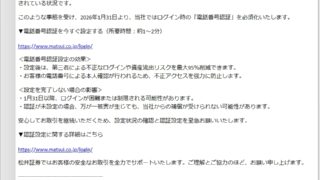 迷惑メール 件名: 【注意喚起】被害急増中|1月31日までに電話番号認証の設定を強くお勧めします【松井証券】