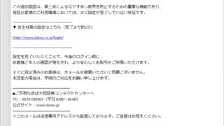 迷惑メール 件名: 【大和証券|セキュリティ設定のお願い】お客様の認証機能が未設定です Created at: 2026/1/22 8:17:28 JST ( Delivered after 11 sec )From: 大和ネクスト銀行 <FwDKUIYbrU@jp-c.ne.jp>#DelayFrom*To*Protocol... 2026.01.22 迷惑メール