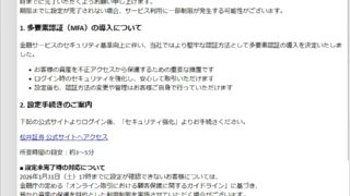 迷惑メール 件名: 【重要】多要素認証(MFA)設定の義務化と重要なお願い Created at: 2026/1/22 7:23:21 JST ( Delivered after 1 sec )From: <>#DelayFrom*To*ProtocolTime received01 secsource:→****... 2026.01.22 迷惑メール