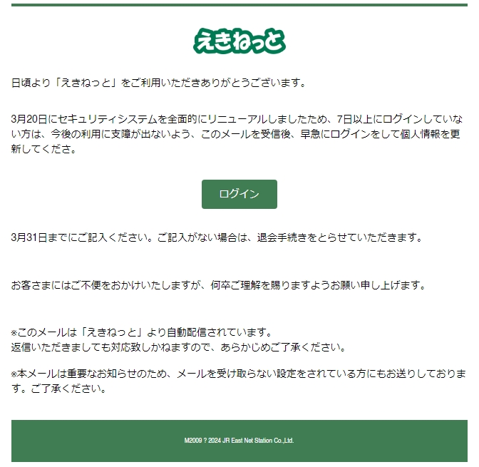 差出人: えきねっと <eki@h6tgy9fx5g.com> 日時: 2024年3月31日 14:49 送信日時: 2024年3月31日 14:39