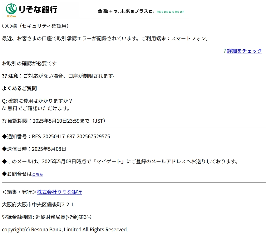 差出人: りそな銀行 <resona-jaddst@service.zffsu.cn>