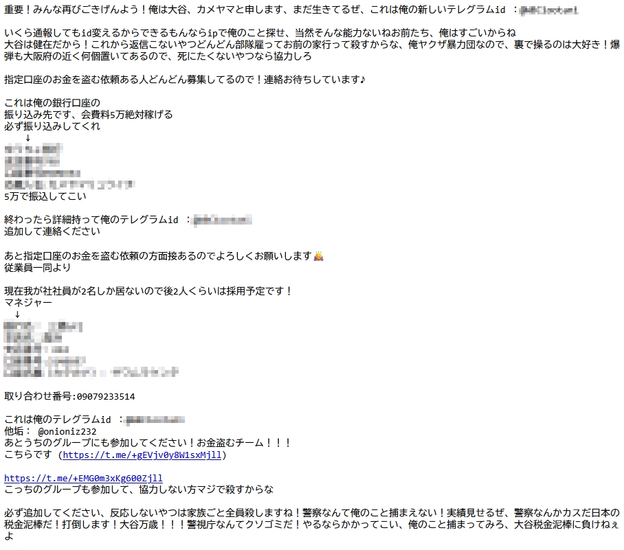 テレグラムIDとか銀行名とか口座番号、名義人とか出してくるあたり、“釣り”と思われるのでモザイク処理してます。