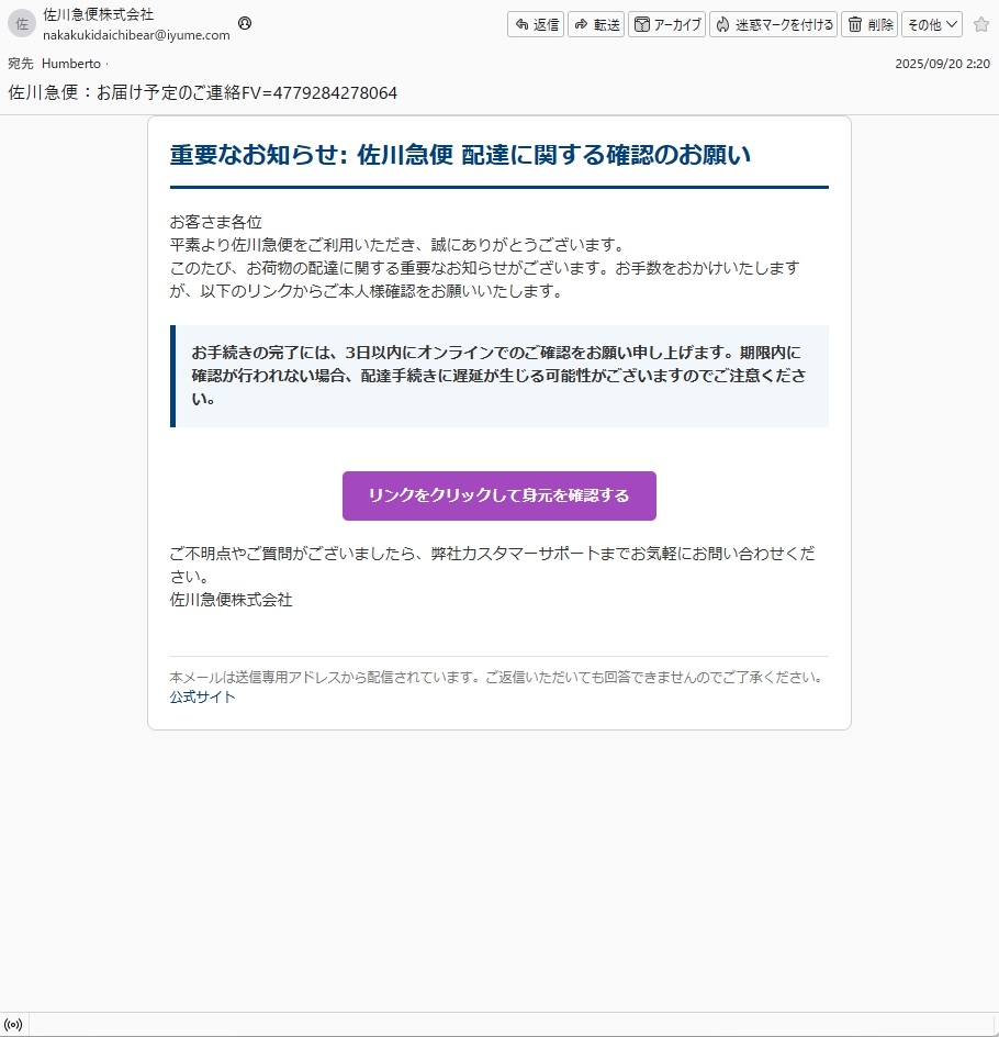 From: 佐川急便株式会社 <nakakukidaichibear@iyume.com>