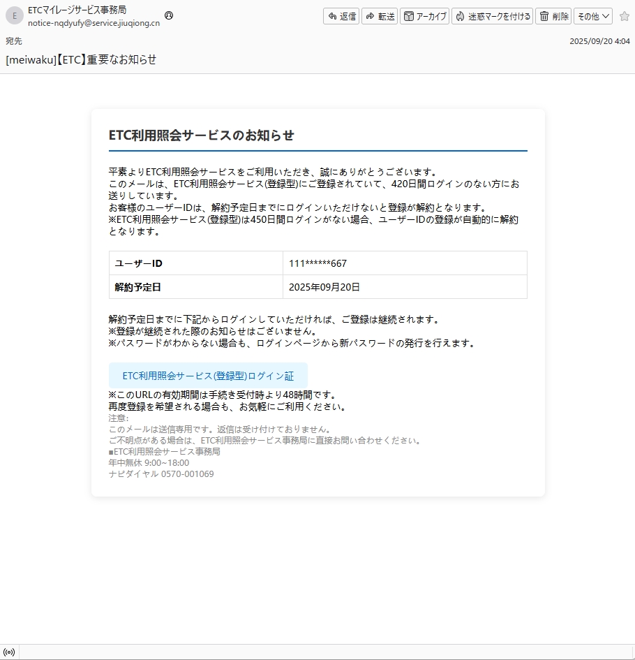 From: ETCマイレージサービス事務局 <notice-nqdyufy@service.jiuqiong.cn> Using Foxmail 6, 13, 102, 15 [cn]