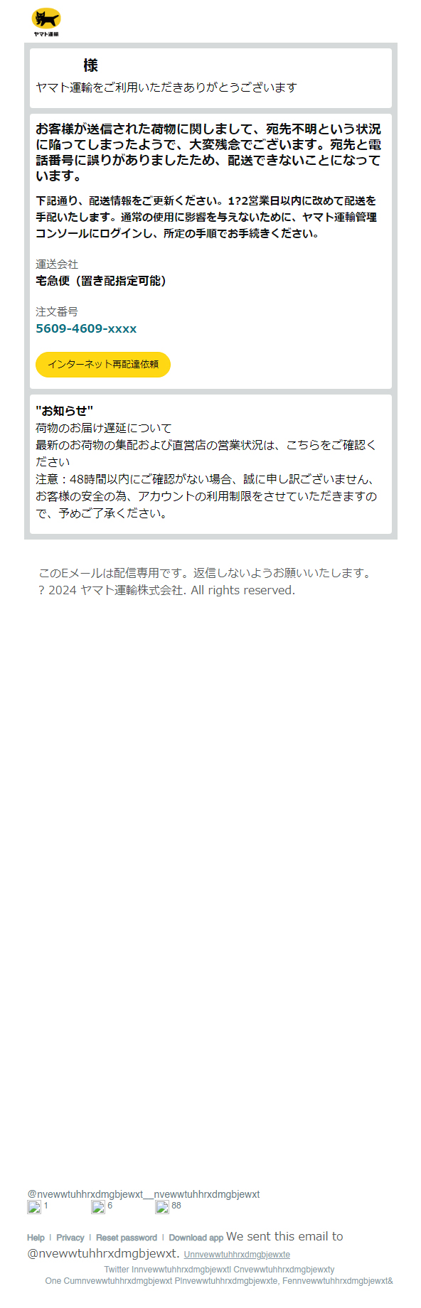 差出人: ヤマト運輸株式会社 <Lolita-*******@bartlett-fall.spatoony.com>