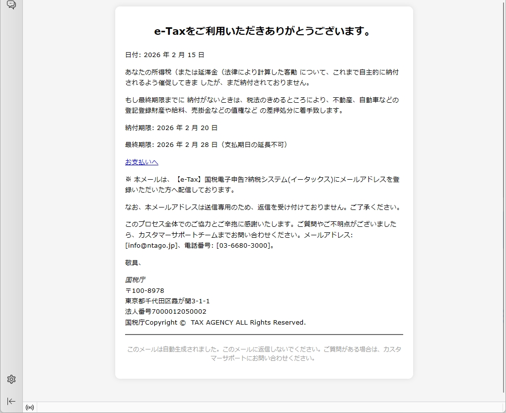 From: 国税電子申告.納税システム <no-reply.hydmjk@ueaoojt.cn> Using Foxmail 6, 13, 102, 15 [cn]