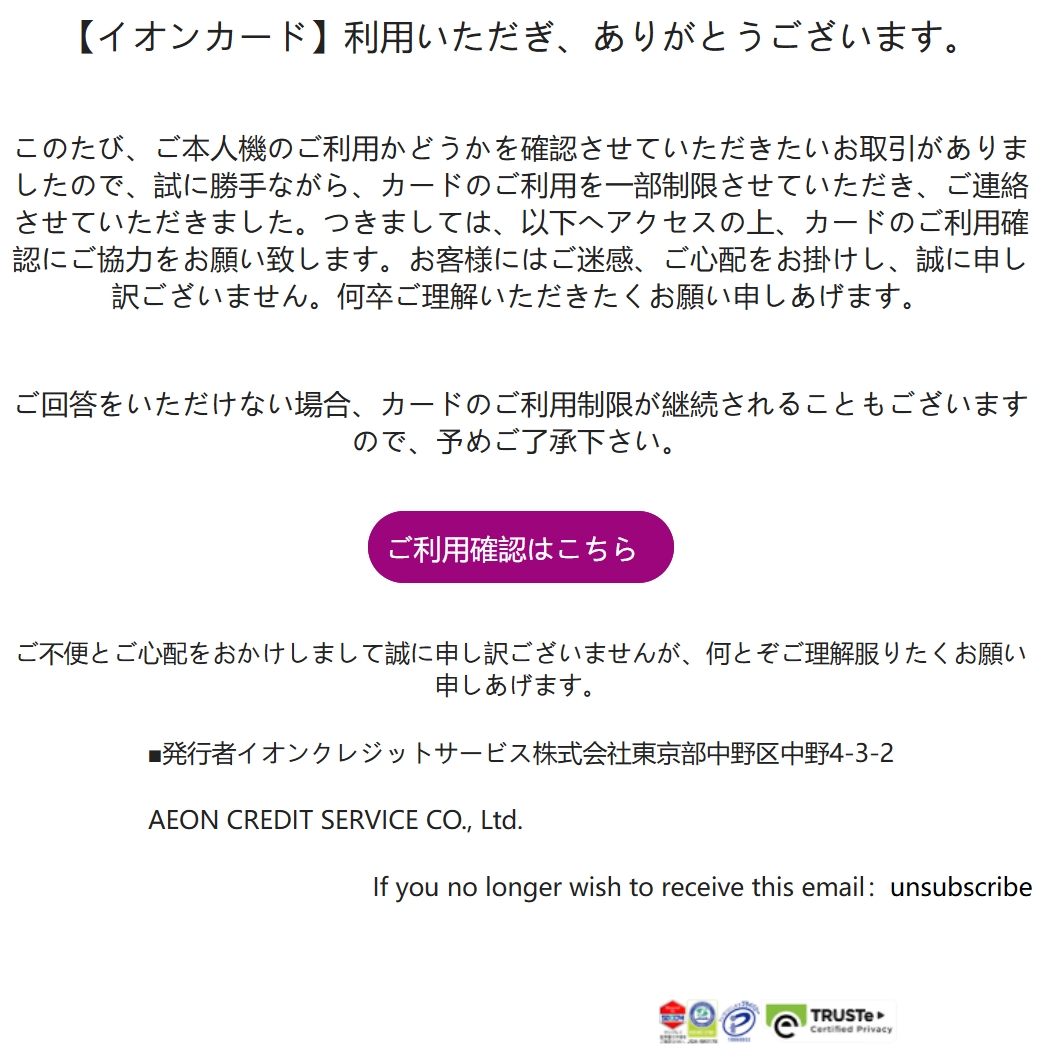 差出人: イオンカード株式会社 <aeon-*******@kita9.ed.jp>