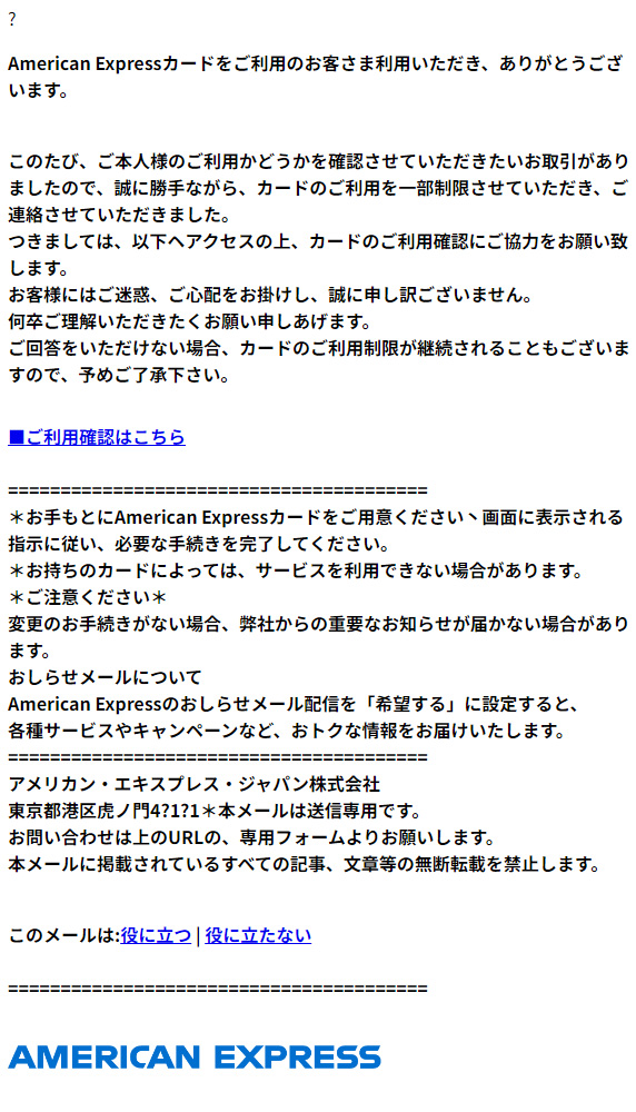 差出人: アメリカン・エキスプレス <support@service.ayayre.cn>