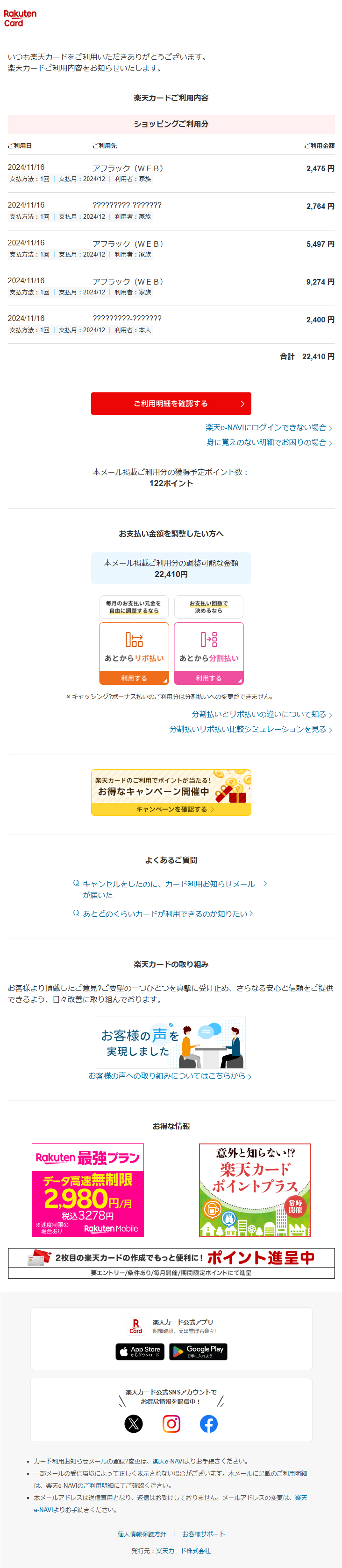 差出人: 楽天カード株式会社 <rakutenu.co.jp-mailady@service.tleqhdgtl.top>