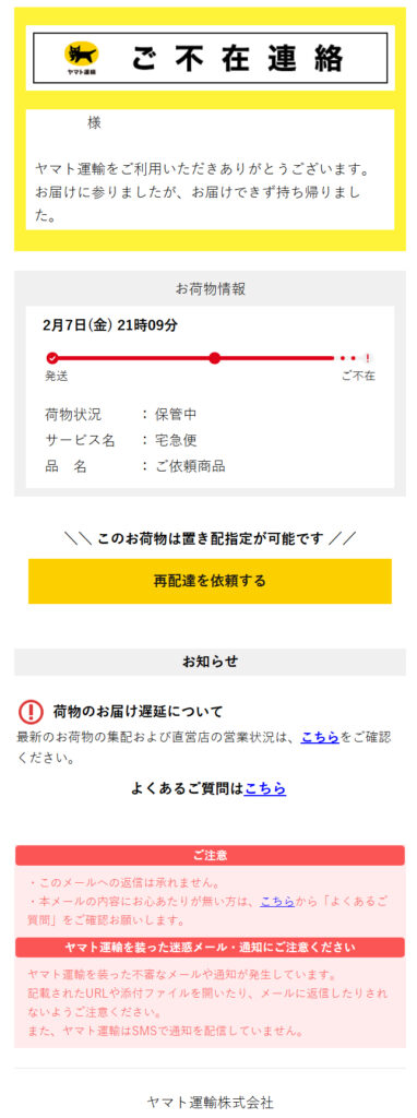 差出人: ヤマト運輸株式会社 <mail@kuronekoyamato.co.jp>