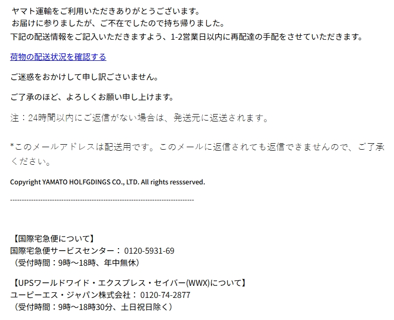 差出人: ヤマト運輸株式会社 <mail@kuronekoyamato.co.jp>