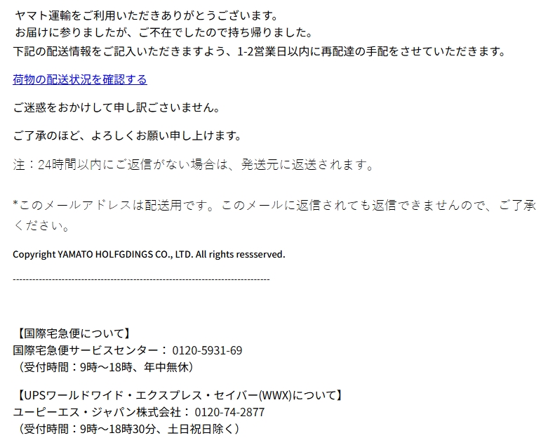 差出人: ヤマト運輸株式会社 <mail@kuronekoyamato.co.jp>