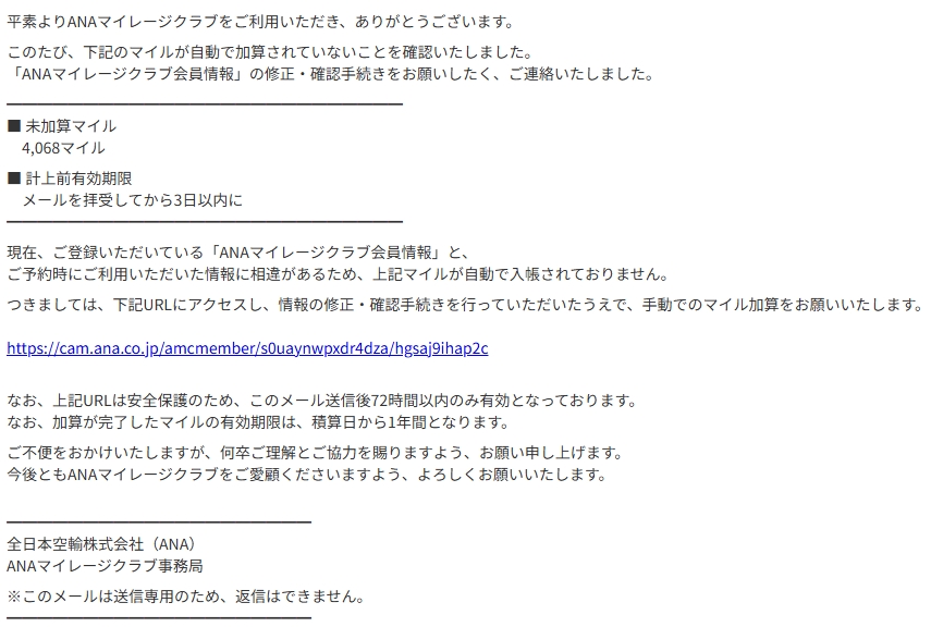 差出人: ANAマイレージクラブ事務局 <ppdw@service.brfc.net>