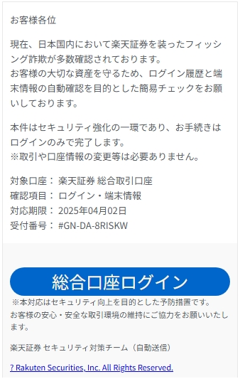 差出人: 楽天証券 セキュリティセンター <sj16y7h5@lces.com>