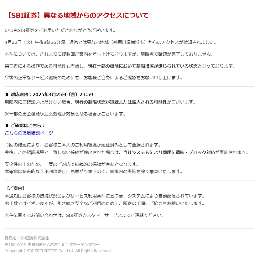 差出人: SBI通信確認 <security-notice@nanno-sozoku.com>